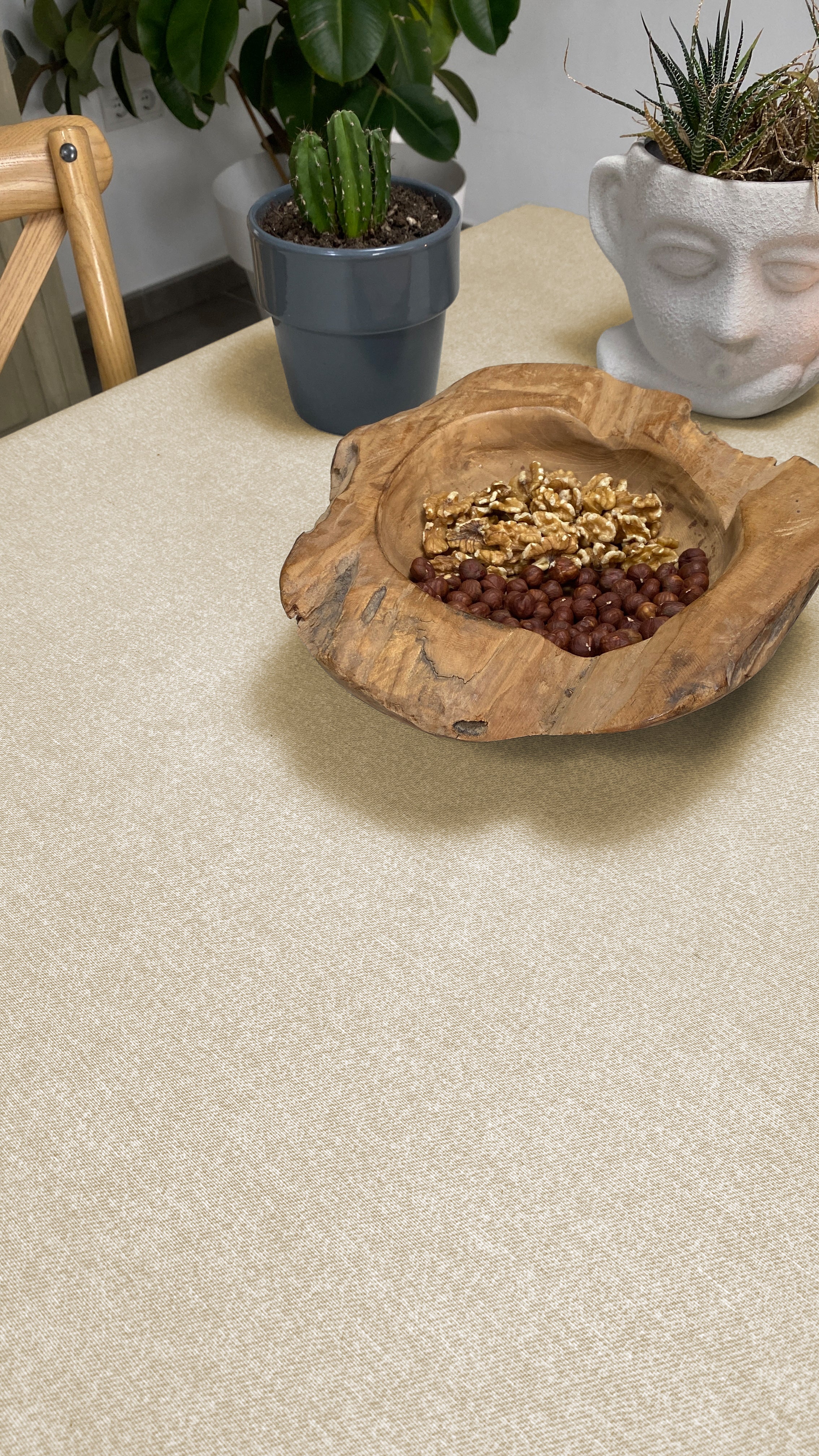 Este mantel antimanchas es producido en telares de la Comunidad Valenciana, los cuales crean un tejido combinado de 50% algodón y 50% poliéster que posteriormente recibe un tratamiento de polímeros acrílicos que proporciona el acabado antimanchas. De esta forma, este mantel es 100% resinado e impermeable, sin perder apariencia textil ni suavidad, y es apto tanto para interiores como para exteriores.
